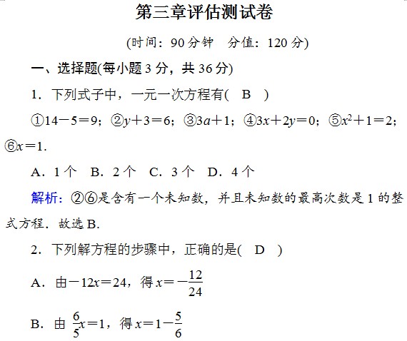 资源名称:初一人教版上册数学第三章评估测试卷